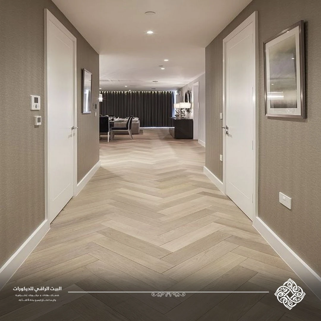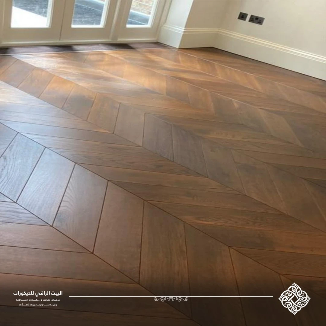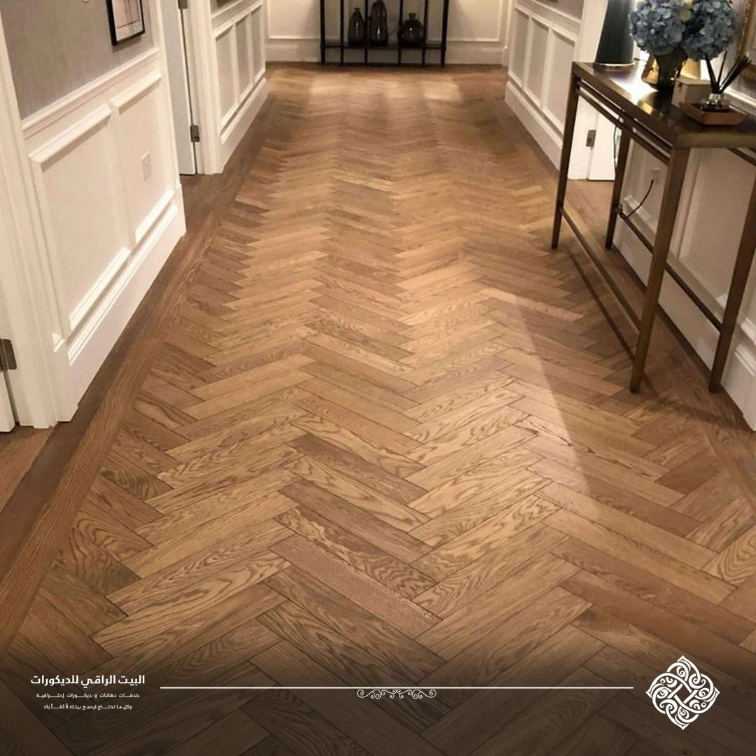 - شكل السلم أو الهيرنج: يعطي لمسة فخمة وفنية ويبرز جمال الخشب الطبيعي.